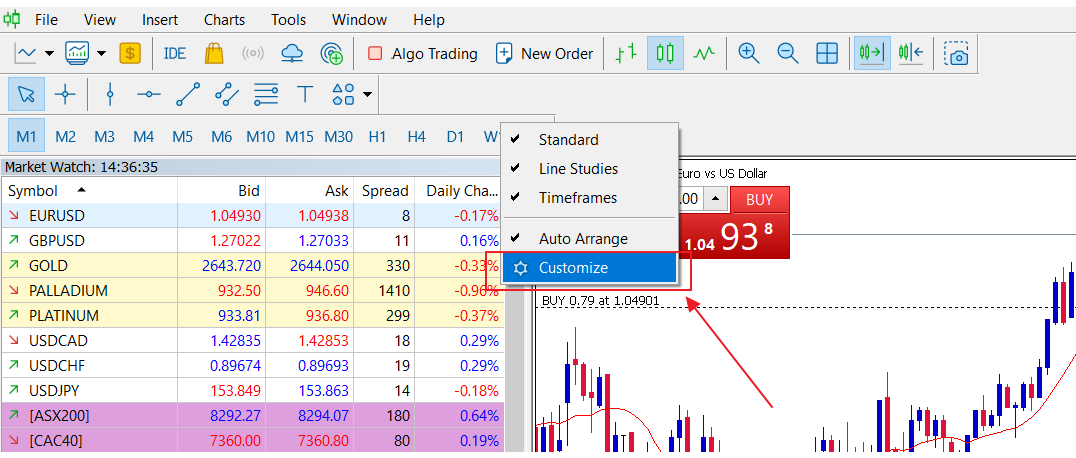 Wenn Sie keine dieser Symbolleisten auf Ihrer MetaTrader-Plattform finden, gehen Sie zum Menü „Ansicht“ und aktivieren Sie die gewünschte Symbolleiste.