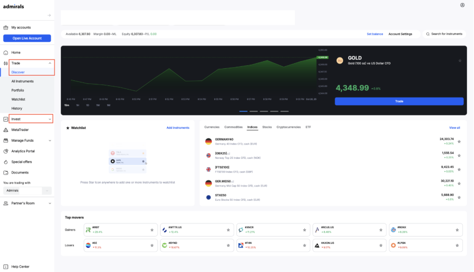 To access the Admirals Platform, please log in to your Dashboard and choose between the following options: Trade or Invest -> Discover: