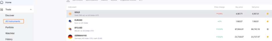 From the “All Instruments” section we can add a certain product to this list. Let's see below an example of the Germany 40 Index.