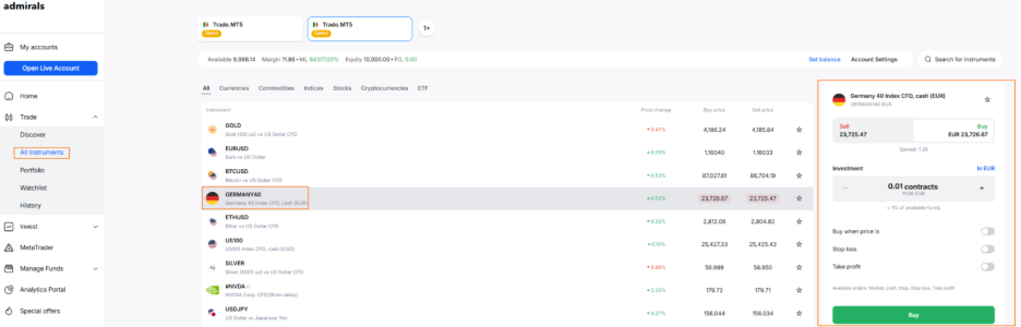 The Admirals Platform is an investment tool that allows you to trade in Trade.MT5 and Invest.MT5 accounts and access the financial markets without installing any program. It works through your web browser, allowing you to access financial markets quickly and from any device.