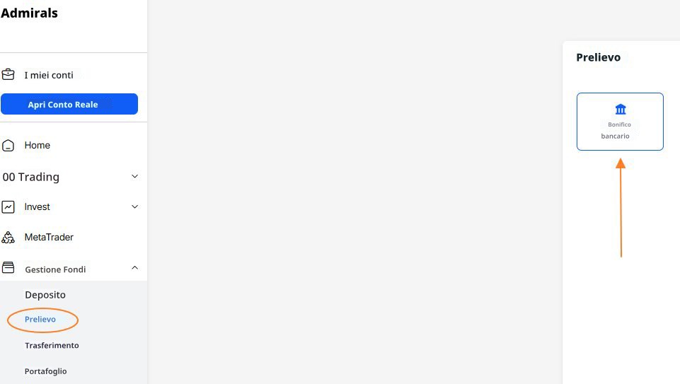 - Apra nuovamente il menu "Gestione Fondi" e selezioni "Prelievo". In questa sezione può visualizzare i metodi di prelievo fondi disponibili. Se desidera prelevare denaro verso la Sua banca, scelga "Bonifico bancario" e prelevi i fondi dal portafoglio al Suo conto bancario.