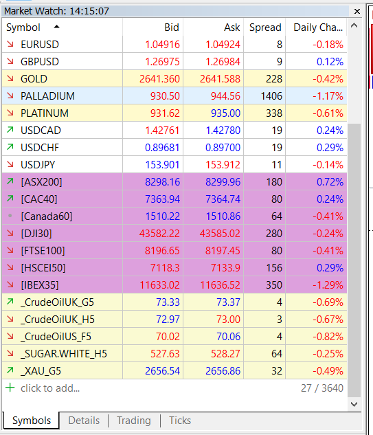 В нашем примере мы расширили «Обзор рынка» столбцами «Спред» и «Дневные изменения», где мы увидим процентное изменение рынка в течение торговой сессии.